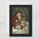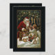 Elegante und zeitlose Weihnachtskunst mit einem lächelnden, roten Roben Weihnachtsmann, der einem Kind im Bett Geschenke schenkt, mit Strümpfen, die in der Nähe hängen und Misteloe über dem Kopf. Die Kunst ist mit goldenen Highlights geschmückt und die Hintergrundfarbe kann bearbeitet werden. Zurück bietet einzigartige, benutzerdefinierte, ergänzende Grafiken mit bearbeitbaren Textfeldern.