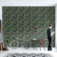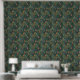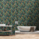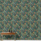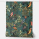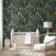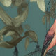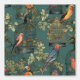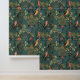 Elegante Tapete mit Vintagen Abbildungen von Vogelkäfigen, tropischen Rot-, Orange- und Gelbvögeln und Grünpflanzen.
