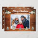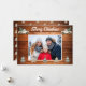 Vintager Holz Weihnachtsbaum auf Truck Family Foto Urlaubskarte. Eine Fotokarte mit "Frohe Weihnachten" Wunsch, Familienname und Foto. Das Design hat niedliche Weihnachtsbäume und 2 Vintage LKW auf einem rustikalen Holzboden. Geben Sie Ihren Namen, das Jahr und das Foto ein.