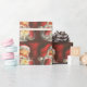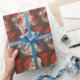 Weihnachtspapier mit dem Bild des fröhlichen Weihnachtsmanns mit seinen roten Fäusten und seiner Mütze, das eine weiße Kerze ausbläst.