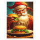 Werbung im Vintagen Stil mit dem Weihnachtsmann, der einen Hamburger oder zwei Weihnachtskarten isst.