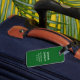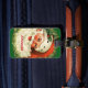 Ein Gepäckanhänger mit einem Retro-Bild mit einem lächelnden glücklichen Weihnachtsmann umgeben von einem Kiefernkranz mit einem Hauch von Heiligen in seiner Kappe.
