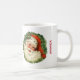 Eine Tasse mit einem Retro-Bild mit einem lächelnden glücklichen Weihnachtsmann umgeben von einem Kiefernkranz mit einem Hauch von Heiligen in seiner Kappe.