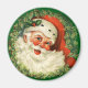 Ein Magnet mit einem Retro-Bild mit einem lächelnden glücklichen Weihnachtsmann umgeben von einem Kiefernkranz mit einem Hauch von Heiligen in seiner Kappe.