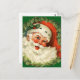 Eine Postkarte mit einem Retro-Bild mit einem lächelnden glücklichen Weihnachtsmann umgeben von einem Kiefernkranz mit einem Hauch von Heiligen in seiner Kappe.
