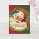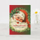 Weihnachtskarte mit einem Retro-Bild mit einem lächelnden glücklichen Weihnachtsmann umgeben von einem Kiefernkranz mit einem Hauch von Heiligen in seiner Kappe.