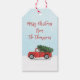 Rustikaler Vintager roter LKW mit einem frischen Weihnachtsbaum im LKW-Bett. Eine niedliche Winterlandschaft, die eine familiäre Tradition darstellt. Eine personalisierte Vorlage für Feiertage und Weihnachtsgeschenke. Dieses Design beinhaltet einen Vintagen Weihnachtsrucker, eine niedliche klassische Winterszene, eine weihnachtliche Typografie-Vorlage, eine einfache Minimalistin bis aus Weihnachten, schicke handgezeichnet alte Mode, klassische Familienname, klassische Landhäuserwälder, trendige Kalligraphie-Drehbuch-Schriftart, rot-grün weiß, Schneeflocken Winter