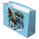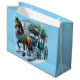 Eine große blaue Geschenktasche, entworfen mit einem Vintagen alten Western Stagecoach Gezeichnet Pferd für Weihnachten