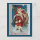 Nostalgisch restaurierte Weihnachtsbild aus Viktorianischer Zeit mit einem rot roten Weihnachtsmann, der eine Tüte Geschenke und Baum im Schnee mit einem dunkelblauen Winterhimmel und Single mit goldenem Stern trägt. Die Farbe der Grenzen kann bearbeitet werden. "Die besten Weihnachtswünsche" in roter Typografie. Zurück bietet ergänzende filigrane antike Grenzgrafik mit bearbeitbaren Textfeldern für Ihre Begrüßung und Personalisierung.