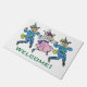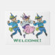 Leicht zu personalisieren diese Begrüßungsmatte mit Ihrem eigenen Text! Vintage Illustration klassischer Kindermärchen von William Wallace Denslow aus dem Viktorianischen Era-Geschichtenbuch Der wunderbare Zauberer von Oz von L. Frank Baum. Drei niedliche tanzende Munchkins aus der Smaragdstadt machen Spaß. Die Jungs sind blau gekleidet und die Tänzerin ist in einem rosa Kleid gekleidet und sie tragen alle lustige Hüte!