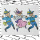 Vintage Illustration klassischer Kindermärchen von William Wallace Denslow aus dem Viktorianischen Era-Geschichtenbuch Der wunderbare Zauberer von Oz von L. Frank Baum. Drei niedliche tanzende Munchkins aus der Smaragdstadt machen Spaß. Die Jungs sind blau gekleidet und die Tänzerin ist in einem rosa Kleid gekleidet und sie tragen alle lustige Hüte!