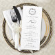 Dieses Vintage Barock Floral Wappen Viktorianisch Wedding Menu in Schwarz und Weiß bietet ein zeitloses, Vintages botanisches Monogramm Wappen, das aus Reben von Blättern und Blumenakzenten besteht.