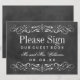 Dekorative Wirbel und Schnörkel umrahmen dieses Vintage inspirierte Gästebuchzeichen mit weißem Text und Monogramm. Hintergrund hat ein strukturiertes schwarzes Chalkboard-Aussehen.