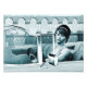 3D digitale Darstellung einer wunderschönen jungen Vintagen Frau, die im Auto auf dem Hintergrund einer Sommerstadt sitzt, blaue Färbung