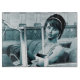 3D digitale Darstellung einer wunderschönen jungen Vintagen Frau, die im Auto auf dem Hintergrund einer Sommerstadt sitzt, blaue Färbung