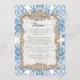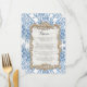 FÖRMLICHES ABENDESMENÜ FÜR DIE BREITE REZEPTION ODER DAS BRAUTPARTY. Klassisches und fabelhaft verziertes, goldfarbenes Aussehen, barocke Rokoko-Rahmen über einem eleganten, blau-weiß-französischen Vintagen Blumenmuster, das von dem international anerkannten Künstler Audrey Jeanne Roberts © restauriert und grafisch gestaltet wurde