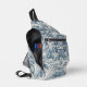 Eleganter Vintager Blue Toile de jouy Monogram Printed Sling Bag. Schönes nahtloses Toile de jouy Muster Blau auf weißem Hintergrund. Die Toilabdrücke sind ein Alltagswut, ein elegantes und verziertes Vintages Jouy mit exotischen Damast-Mustern, einem lustigen Stil, der derzeit für Wohngestaltung, Kleidung, Handy und IPad Hüllen, Einladungen und vieles mehr anzieht. Das Design ist klassisch und zeitlos mit atemberaubender Farbe. Sie können alle Textfarben und Schriftart ändern, klicken Sie, um weiter unter dem Bereich der Textanpassung, der Sie in das Design-Tool führt, anzupassen. Ein einzigartiges Geschenk für Geburtstag, Urlaub und jeden besondere Anlass. Ob zum Valentinstag, zu Weihnachten oder als Geschenk im Allgemeinen - es ist eine tolle Geschenkidee