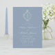 Diese elegante dustig blaue und silberne Hochzeitseinladung mit Vintager Luft hat alles: "etwas Altes, etwas Neues, etwas geliehenes, etwas Blau". Das Vintage blumengeschmückte Wappen in Imitaten aus Silberfolie, das das Monogramm enthält, wird "geliehen" von einer alten Buchcover-Bindung, "Rust, Smut Mildew & Mold", ab 1870, jetzt öffentlich zugänglich. Der blaue Hintergrund hat eine neue, moderne Nuance, die "staubige Blau" heißt. Die Namen der Braut und des Bräutigams sind in einer eleganten kalligrafischen Schrift geschrieben. Alle Texte können personalisiert sein und haben eine silbergraue Farbe, ähnlich dem Imitat silberne Wappen.