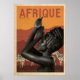 Wunderschön illustriertes antikes Reiseplakat mit afrikanischer Stammesfrau und einer Gruppe Zebras gegen einen afrikanischen Sonnenuntergang. Natürliche Farben, einschließlich Orange und Retrobraun