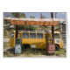 Vintages gelbes Van und alte Treibstoff-/Tankstelle