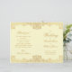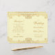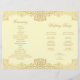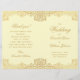 Ein elegantes, gefaltetes Hochzeitsprogramm mit Vintager Luft, das auf beiden Seiten zwei elegante Vintage Golddekorationen an den Rändern (oben und unten) hat. Die Titel und die Namen der Braut und des Bräutigams sind in einer eleganten kalligrafischen Schrift geschrieben, die Erholung in Kappen. Der Hintergrund ist cremefarben (hellgelb), der Text ist goldfarben, ähnlich den goldenen Dekorationen an den Rändern. Für die Hochzeitsfeier auf der Rückseite stehen das Brautteam und das Bräutigam auf separaten Säulen. Die elegante Golddekoration stammt aus einem Vintagen französischen Buchcover, der aus dem späten 19. Jahrhundert stammt und heute im öffentlichen Besitz von Nicolas Denis Derome (1731-1790), bekannt als Derome le Jeune, für ein Buch mit dem Titel "Gaspar Pergam Epistol" steht.