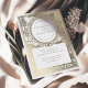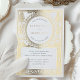 Diese exquisite Hochzeitseinladung im Vintagen Stil besticht durch ein verziertes Laurel-Kranz-Design in weichem Gold, das die Details der Hochzeit auf raffinierte und zeitlose Weise umreißt. Intrikierte Schnörkel, darunter Regalrollen und detaillierte Motive, dekorieren die Grenze und schaffen ein luxuriöses und elegantes Aussehen. Die klassische Serifentypografie ergänzt die Goldakzente, während der weiße Hintergrund das Design frisch und sauber behalte. Die Rückseite der Karte ist mit einem minimalistischen Monogramm und passenden dekorativen Elementen geschmückt, was die raffinierte Anziehungskraft der Karte erhöht. Ideal für feierliche oder traditionelle Hochzeiten, ist diese Einladung ideal für Paare, die Vintagen Charme mit einer modernen Touch schätzen, dank der Kombination aus Gold, Weiß und Creme.