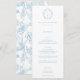 Vintag Regency Era Wappen Monogramm, Hochzeitsmenü. Vintages inspiriertes Barockstil-Wappen mit Koordination der hellblauen Typografie. Die elegante Chinoiserie Stil Garten Blumenmuster Rückenlehne.