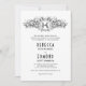 Vintages heraldisches Wappen mit Initialen Hochzeitseinladung. Es verfügt über einen schwarz-weißen Blumenrahmen mit Ihrem Monogramm in einem heralischen Wappen und Blume, Blätter und Granatapfeln. Die Rückseite ist mit schwarz-weißem Polka-Punktmuster bedeckt.