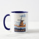 Dieses Ausrüstungsbeschreibungen eine posterized Illustration der niederländischen Landschaft einschließlich zwei Windmühlen.