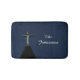 Diese luxuriöse, dunkelblaue Badematte ist mit einem Vintagen, weißen Holzkreuz auf dunkelblauem Himmelshintergrund geschmückt. Es ist mit zwei Zeilen hellgrauem Text personalisiert. Ein tolles Geschenk für eine Hochzeit oder Hauswärmung. Original Foto von Marcia Socolik. Alle Rechte vorbehalten © 2015 Alan & Marcia Socolik.
