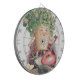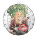 Antiquitätenbild aus dem 19. Jahrhundert, mit einem lächelnden Gesicht, rosa Wangen, humanisierter Topf-Pflanze aus vierblättriges Kleeblatt Kleeblättern, umgeben von einem roten Puffherz und einer Schlüssel, und einem hübschen goldgelben Schmetterling. Viel viel Glück!