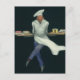 Vintage Illustration der Lebensmittel- und Bäckereiindustrie mit einem beruflichen französischen Bäcker mit einem extravaganten Hut und einer Schürze. Ein Koch mit hausgemachtem Gebäck, Kuchen, Keksen, Kuchen, Süßigkeiten und anderen Desserts auf den Backwaren frisch aus dem Ofen in der Bäckerei. Er ist so glücklich, dass er so aussieht, als tanze er!