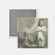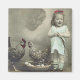 Vintages Magnet von kleinen Mädchen stehend mit einem Hahn und Huhn mit dem Huhn auf ihren Eiern legen.