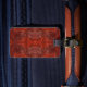 Abstrakte Textur aus Vintagem Mahagoni oder teurer gegerbtem echtem Leder. Das elegante, goldbraune Muster in edlen Farben ist perfekt für einen Gepäckanhänger, was es zu einem Geschenk für jeden Anlass, vor allem für einen Reisenden, macht.