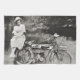 Ein amerikanisches Mojo Küchen- oder Teetuch mit einem Vintagen Sepia-Foto c1920 meiner glücklichen lächelnden Großmutter, die auf der Rückseite eines alten Motorrads sitzt. Ich weiß nicht, dass machen Sie, aber das Fahrrad Riemenantrieb ist, Acetylenlichter und Premier auf dem Kurbelkasten hat.