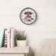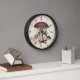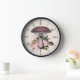 Die hübsche Vintage Wanduhr ist mit rosa gefärbtem Pilz mit rosa Blumen und üppigen grünen Blätter auf einem Vintag gestreiften Hintergrund mit römischer Ziffernuhr ausgestattet.