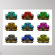Verfügt über Vintage Oldtimer in verschiedenen Farben.