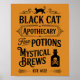 Eine elegante Werbung für das Black Cat Apothecary, die vor einem Vintagen orangefarbenen Hintergrund feine Tränke und mystische Brauen verspricht.