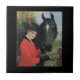 Fliese mit einem Vintagen Bild einer jungen Frau in einer roten Reitjacke ungefähr, zum ihrem Pferd eines Zuckerwürfels zu füttern.