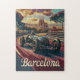 Ein faszinierendes Vintages Design mit Barcelona während eines lebhaften Sonnenuntergangs, mit einem klassischen Rennwagen im Vordergrund. Das Kunstwerk verbindet wunderbar die berühmte Architektur der Stadt wie die Sagrada Familia mit der eleganten Eleganz eines Retro-Rennwagens. Die warmen Farbtöne des Sonnenuntergangs verstärken das nostalgische und romantische Ambiente und schaffen eine Szene, die sowohl Spannung als auch zeitlosen Charme ausstrahlt.