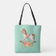 Schultertasche mit einem charmanten und fantasievollen Bild eines alten, rosafarbenen Rockpferdes mit extravagantem Blumenstrauß in Rosa und Gelb. Der Hintergrund ist ein hellgrünes, glänzendes Damast-Muster.