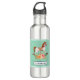 Personalisierte Wasserflasche mit bezauberndem und fantasievollem Bild eines alten, rosafarbenen Rockpferdes mit hübschem Blumenstrauß in Rosa und Gelb. Der Hintergrund ist ein hellgrünes, glänzendes Damast-Muster.