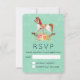 Eine RSVP-Karte mit einem charmanten und fantasievollen Bild eines alten Rockpferdes mit extravagantem Blumenstrauß in Rosa und Gelb. Der Hintergrund ist ein hellgrünes, glänzendes Damast-Muster.