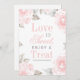 Elegantes und romantisches Hochzeitszeichen-Design bietet eine Grenze von weichen rosa Rosen mit grün / grau Blätter. Blume haben ein schönes Aquarellbild. Enthält den Wortlaut "Liebe ist süß, genießt eine Leckerei".
