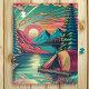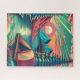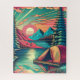 Puzzle zum Thema Camping. Die Grafik ist eine rosa und aquamarine Vintage Campingszene mit Zelt, Sonnenuntergang, See und Kiefern.