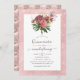 Quinceanera Einladung mit rot-rosa und goldfarbenen Blumen mit schimmernden Sequinen und getufteten Imitaten Ledermustern.