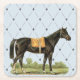 Paper Untersetzer bietet Handsome Black Ross mit Sattel in vollfarbiger Vintager Illustration auf hellblau gemustertem Hintergrund