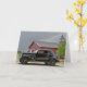 Altes schwarzes Auto geparkt von einer roten Scheune und Himmel Hintergrund mit Regenbogen zum Geburtstag. Alle Texte können bearbeitet werden.