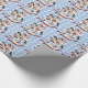 Niedliches Verpackungspapier, das eine Vintage Fünfzigerjahre Illustration eines Jungen und des Mädchens auf einem Schwingpferd kennzeichnet. Hintergrund ist ein niedliches blaues Polkapunktmuster.