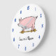 Eine Wanduhr mit Vintager Kunst eines rosa Spielzeugschweins auf Rädern, restauriert aus einem Kinderbuch und blauen Zahlen. Passen Sie es an, um Ihre Schriftart auszuwählen und Ihren Namen oder Ihre Nachricht, Hintergrundfarben und mehr hinzuzufügen.